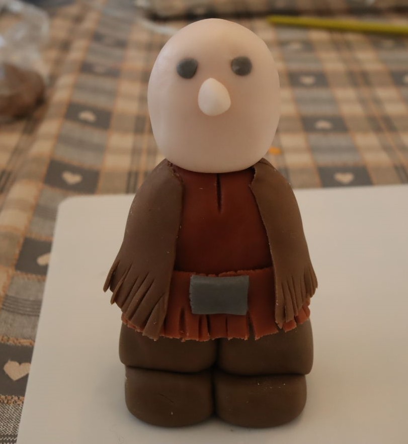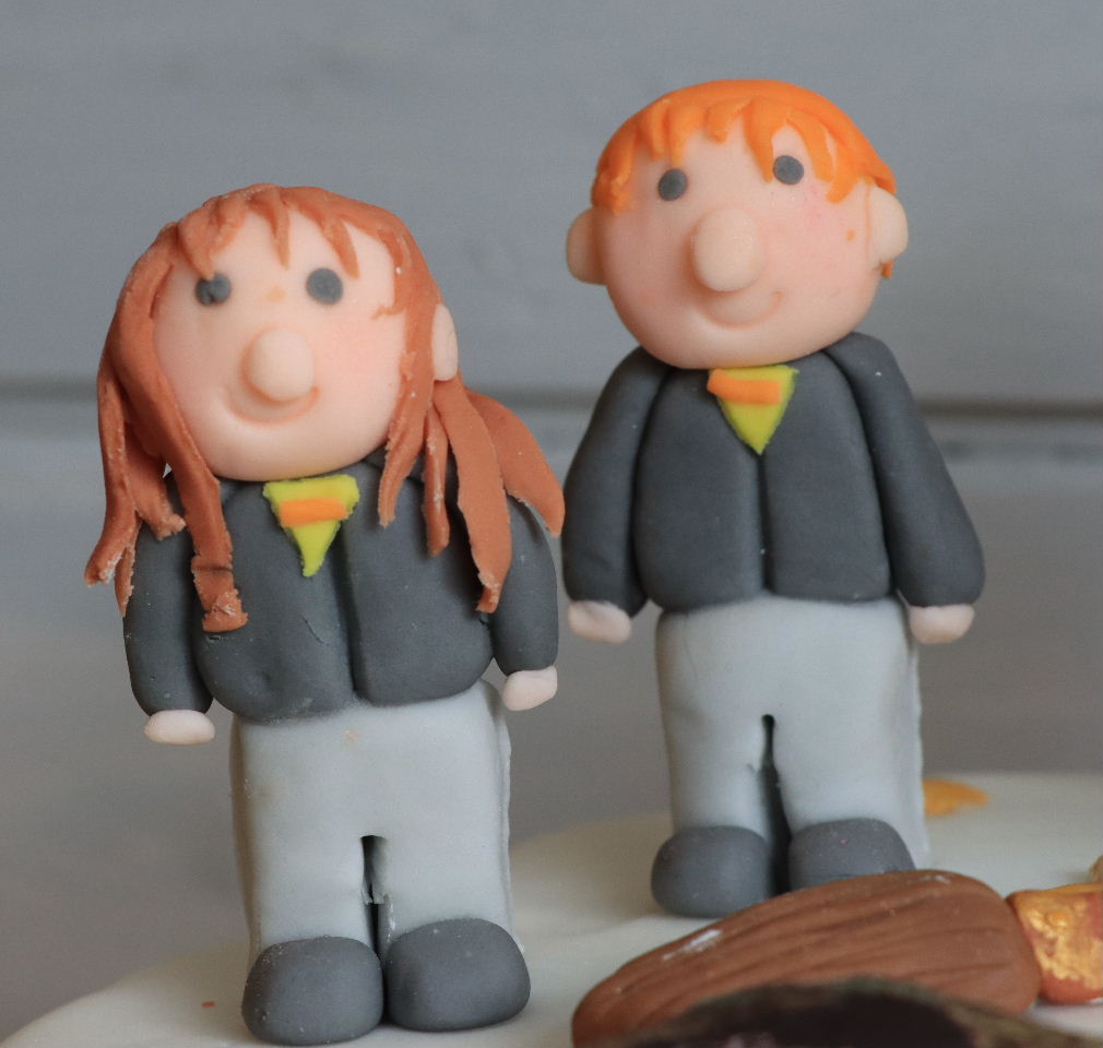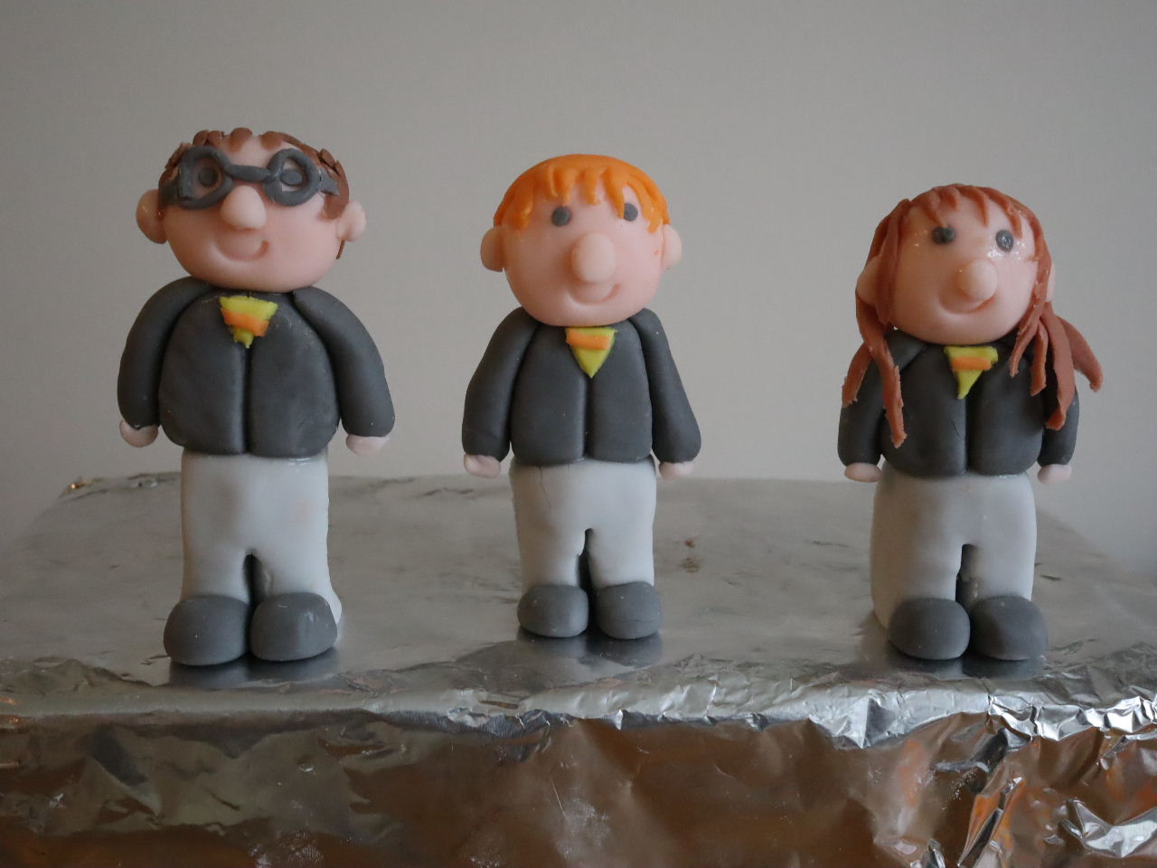 part in the figure and part in the cake to keep them secure. Hagrid, the magic wand, broomstick and the spell book when then added. Finally I made a scarf and placed that around the cake.